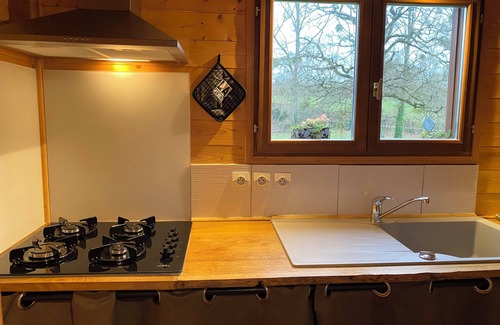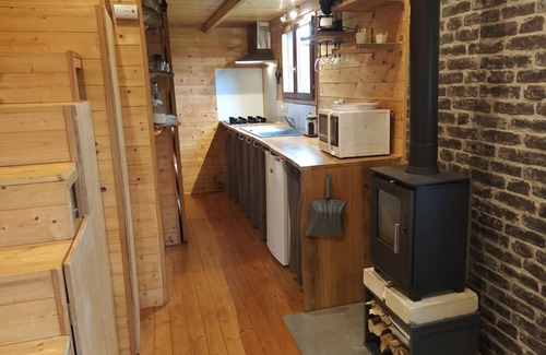 With its sleeping area for two people on the mezzanine, a cosy dining area, a kitchen, a pretty wood-burning stove, dry toilet,anda shower.