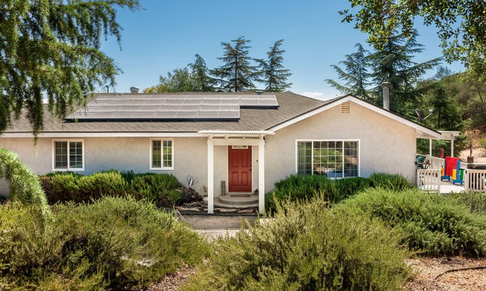 This eco friendly home is nestled among majestic oaks and pines in the wine region of Ramona, CA. This Mountainside Retreat is a magical space for small families and couples to come relax and re-connect with nature, each other, and themselves. The outdoors provide an unbeatable atmosphere for the perfect getaway with breathtaking views of mountain tops, seasonal streams, a bridge waterfall, hot tub, fire pit, BBQ, pick-nick tables, park benches, one of a kind horse shoe pit! disk golf, corn hole and private hiking trails!