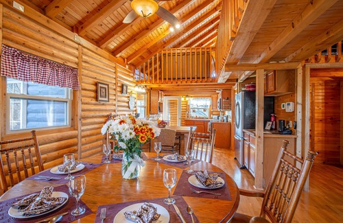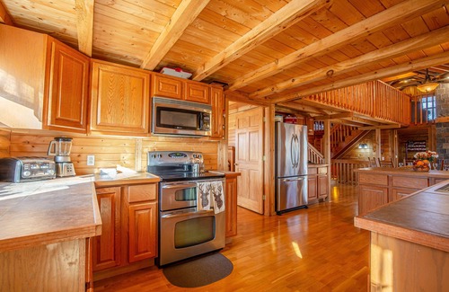 The 2600 square foot 3.5 bath log home sits on 40 acres. The home features four spacious bedrooms with plush beds, a large surround deck in the tree tops, high speed internet & access to private walking trails that wind through the woods complete with limestone cliffs and pollinator prairies. The interior of the home is lined with pine boards that give off a pleasant aroma and add to the character adding to the cabin feel but the home is well appointed and has all the features you will likely need.