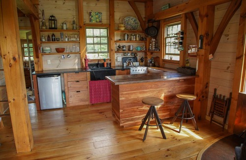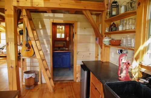 The main cabin features solar-powered electricity and hot water, a fully-equipped kitchen and sleeping for up to eight adults in the open plan living area and sleeping loft. (A second, more rustic cabin, can sleep a few more guests for an extra fee.)