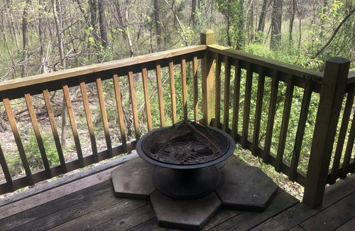 This Nature's Nook includes an outdoor hot tub, fire pit, gas grill, and kitchenette.