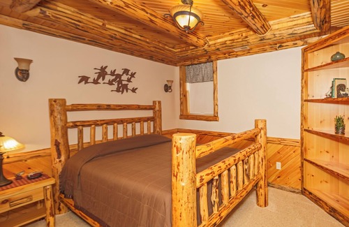 From the gorgeous log woodworking to the trail-themed artwork, you will step into this lodge suite and be surrounded by beauty. With two private master bedrooms each with a queen size bed, a spacious living room with the gas fireplace and TV, the full kitchen and dining room, and large bathroom with a tiled, walk-in shower and two-person Jacuzzi, guests feel right at home in this deluxe suite. (All the lodge suites come with a fully-equipped kitchen featuring: refrigerator with ice machine, dishwasher, glass cooktop, microwave, toaster, pots and pans, silverware, dishes, and Keurig with complimentary coffee, teas, creams, and sugars. Each suite has a fireplace, Jacuzzi, high-speed WIFI, central AC, and hi-def satellite TV. They all have access to the outdoor firepit and courtyard area as well as the hiking trails. The firepit comes with firewood, kindling, and a steel grate.)