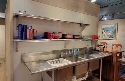 The multi-purpose room has a 4’ x 7’ table, water-based art supplies, clothes dryer, utility sink, open shelving for your stuff, a 9 ft. clothing rack that is high enough to hang gowns and lengthy clothing.