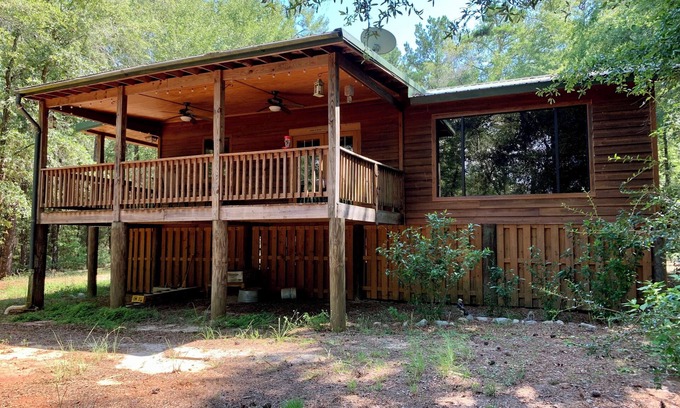 Escape to our beautiful riverfront cabin, where relaxation and adventure await! Enjoy five acres of riverfront property with exclusive access to our private swimming hole, perfect for a refreshing dip or lounging in the sun along the banks of the river or bring your canoe or kayak to experience the beauty of nature from the water! Nestled in Red Level, Alabama in Conecuh County, our property provides easy access to Pigeon Creek. Our cozy cabin features a spacious open floorplan connecting our comfy living room to the fully equipped kitchen with all of the modern amenities. Our cozy two bed and one and a half bath cabin is the perfect blend of comfort, nature and fun making it the perfect escape for families, couples and friends. Experience the beauty of nature and listen to the sounds of the river from the front porch. It’s the perfect backdrop for your morning coffee or evening cocktails. There are water activities. Bring your own boat or Kayaks