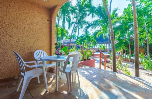 Featuring two beautifully appointed bedrooms, the condo is designed with 'Mexican Beach Decor,' accommodating up to five guests comfortably. The master bedroom includes a king-sized bed, while the guest bedroom boasts a queen bed and a single bed. Step outside onto your private patio that overlooks Isla Mujeres’ exquisite gardens, with easy access to the large pool and the onsite 'Sunset Grill'—a popular spot for couples to celebrate their vows. Enjoy additional amenities like beach chairs, umbrellas, and a swim-up bar at the pool for relaxation after your wedding festivities.