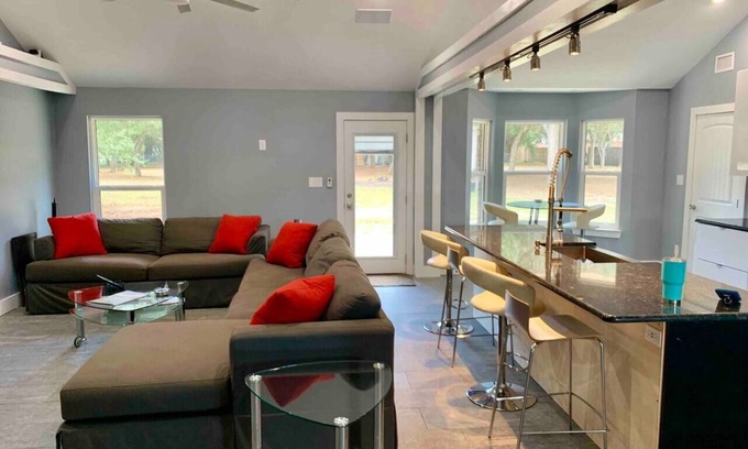 The kitchen is open to the living room and is furnished with essential cookware, dinnerware and silverware. Also, it features granite countertops and modern stainless steel appliances. Feel free to use the full size, large capacity washer and dryer (free) located in the laundry room; off from the kitchen.
