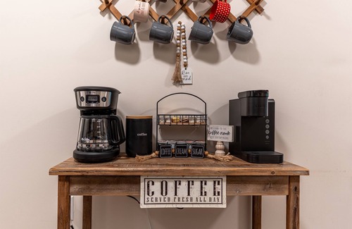 We have a fully-stocked kitchen with plenty of room to cook your favorite meals. There's also a stocked coffee bar with k-cups, ground coffee, and a variety of sweeteners.