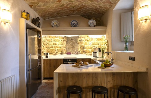 Roomy, modernized, stylish "castle" with tower and air conditioning in a medieval village 25 minutes from the best Costa Brava beaches. Ideal for weekenders or vacationing families, cycling groups, golfers, history buffs, and foodies. Dining/cycling/cultural sites nearby. 1 1/2 h from Barcelona with updated kitchen, bathrooms and heating system. Large communal spaces for dining and relaxing, with an outdoor terrace and garden.