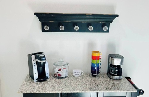 ✓ Coffee bar with a traditional drip coffee maker and Keurig: stocked with coffee, creamers, and sweeteners