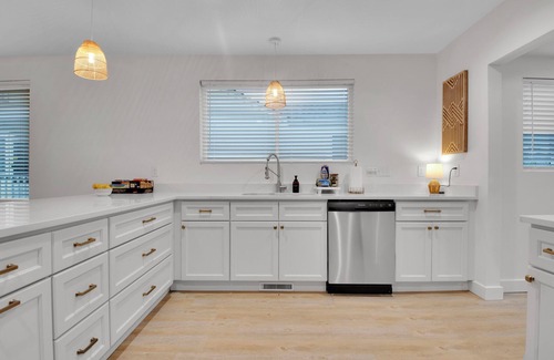 This newly renovated 1-story home combines comfort and convenience. Inside, you’ll find three spacious bedrooms: a master suite with a king bed and private bath, a second bedroom with a king bed, and a third with two queen beds. The full kitchen has everything you need for preparing meals, while the living room offers a comfy couch, TV, and games for relaxing after a day out.