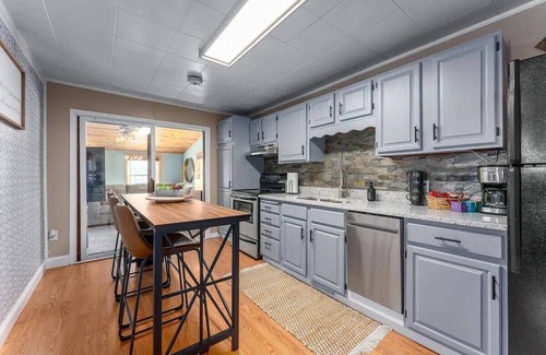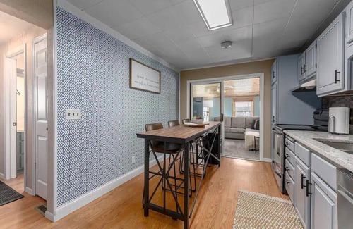 Spacious home with river views—perfect for groups! Sleeps 12 with 5 cozy bedrooms and 3 separate gathering areas, including a game room with foosball and video games. Enjoy a firepit, walk to trails, or relax with a book. The home blends historic charm with modern updates like granite counters and smart TVs. Just a half mile from downtown and steps from the water. A peaceful, fun, and memorable stay awaits!