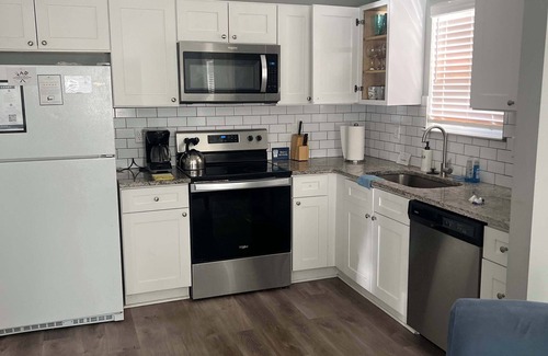 Guests will enter the home through the front door with a digital door code. Once inside, you'll see the spacious living room with a queen sleeper sofa, additional seating and a large smart TV on your right. Past the living room is the open-concept kitchen that is ready for all your cooking needs. The dining room rounds out the main floor living spaces and features a large dining table with bench seating. The master bedroom is on the first floor and features a king bed, oversized closet, and ensuite bathroom. The remaining bedrooms are upstairs, which can be accessed from the stairs off the foyer. The second and third bedrooms both have a queen bed. The fourth bedroom has two twin over twin bunkbeds, one queen bed, tv, and games, making it perfect for kids! There is a full hallway bathroom upstairs. There is a small patio with an outdoor dining area and charcoal grill available for use in the backyard!