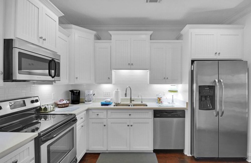 Upstairs, there are three bedrooms and the laundry room. The master suite with a King-size bed offers a full walk-in closest with plenty of storage and an en-suite bathroom with his and hers sink area, large walk-in shower, garden tub and separate restroom area with a door for privacy. The two additional bedrooms each have queen size bedding and they share a bathroom with a combination tub/shower.