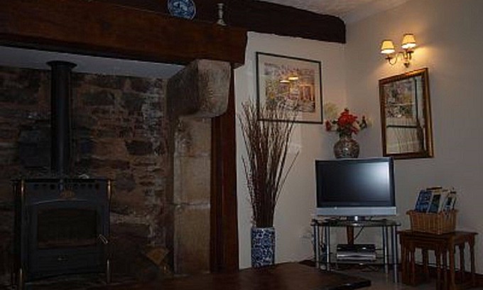 Beautiful living area with original fireplace and a log burning fire, 3 seater sofa and 2 armchairs.