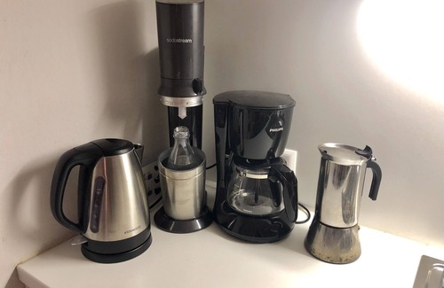 Kitchen: ceramic hob (4 fields), refrigerator, dishwasher, coffee maker (filter and Italian espresso machine), toaster, kettle, soda stream, blender, basic food (spices, vinegar, oil ... in organic quality)
