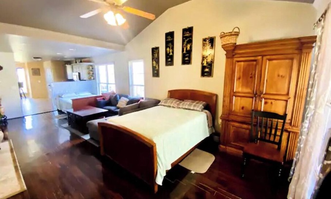 Guest Bedroom- Queen size bed, Tv, shared bathroom.
