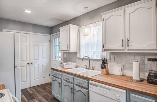Guests will enter the home through the front door with a digital door code. Once inside, you'll be in a spacious living room with a queen sleeper sofa, large Smart TV, and extra seating. The dining room is just off the front door on the right, where you'll find a large table with bench seating so everyone can hang out together! Just past the dining room is the fully-equipped kitchen where you'll find everything you need to cook a full meal. The hallway off the living room will take you to the bedrooms and bathrooms. The first bedroom has a full bed and there are two full beds in the second bedroom. The master bedroom has a queen bed and an oversized ensuite bathroom with a shower/tub combo and a double sink vanity. The backyard is fenced-in and features a patio table with four chairs and a charcoal grill!