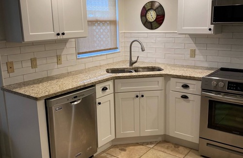 The fully equipped, eat-in kitchen has a new dishwasher, a refrigerator with a water filter, ice maker, white cabinets, a large double sink and granite counter tops.