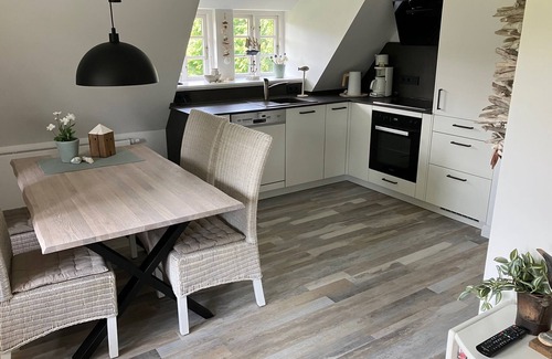 Cozy upper floor apartment The accommodation is distributed on the ground floor and 1st floor. Room layout: 2 bedrooms, 1 kitchen, 1 bathroom with shower. Features: Award: Pets allowed on request, non-smokers. Outside: garden, terrace, patio furniture. Children: high chair, toddler bed. Kitchen / household: oven, filter coffee machine, dishwasher, microwave. Entertainment / communication: additional flat-screen TV, satellite TV, WiFi access.