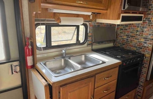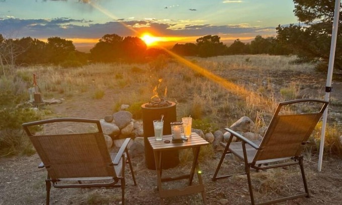 27 foot camper with one bedroom (full size) and one sofa bed (twin) in a certified dark sky area. The sky can be mesmerizing. The camper is surrounded by mountains and the valley sits below. There are 2 zero gravity chairs which recline 170 degrees so that you can comfortably face the sky for amazing star gazing and relaxation (they include drink holders and adjustable head rests). The camper has a very functional kitchen and a booth style dining area. Well stocked kitchen with a variety of pots and pans, cooking utensils, and much more. Great for preparing meals. Organic freshly ground coffee provided as well as sugar and creamer for a nice cup of coffee in the morning (hot chocolate, mocha, and tea provided as well). Tea kettle and Malita (French press as well). Also, there is pancake mix/syrup/butter and organic oatmeal. Some condiments provided and several spices provided. Hot and cold water in the double kitchen sink, the bathroom sink and the shower. The bathroom utilizes a flushable portable toilet. Dimmable overhead lighting. Wi-Fi with the ability to stream video. The outdoor space has a table with chairs and a shade tent. There is a grill with an adjacent prep/serving table. A propane fire pit livens up the outdoor area. Many windows and 3 skylights provide abundant natural light. Powerful 13,500 BTU air conditioner. Drinking water is provided from a pristine mountain aquifer from our well which it put through reverse osmosis. Water from the tap is also delicious as it comes from a mountain aquifer via our well. Enjoy The Great Sand Dunes, Zapata Falls, hiking trails, mountains and wide open spaces.