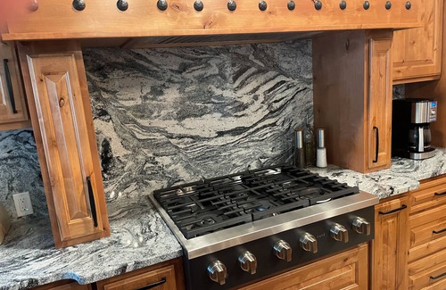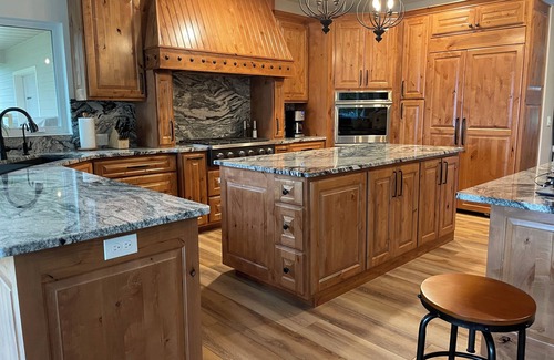 The home comfortably sleeps 8, and each bedroom features a king bed. The bedroom layout includes a first floor master with ensuite and three spacious bedrooms in the lower level. The master bathroom has a tiled walk-in shower and dual vanities. There are two full bathrooms on the lower level, and a powder room located off the front entrance. The main living area has a La-Z-Boy leather reclining sectional along with an internet connected 65 inch TV. The adjacent bar seating allows relaxing views of the lake. It opens to a chefs kitchen with custom Amish crafted dining table. The kitchen is well appointed with high end appliances. It features dual islands providing generous food prep and entertainment space. Between the expansive dining table, bar seating and open floor plan it allows for wonderful dine in experiences. In addition there are amenities like AC, WiFi, a washer/ dryer, gas grill, and three beverage refrigerators.