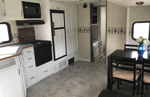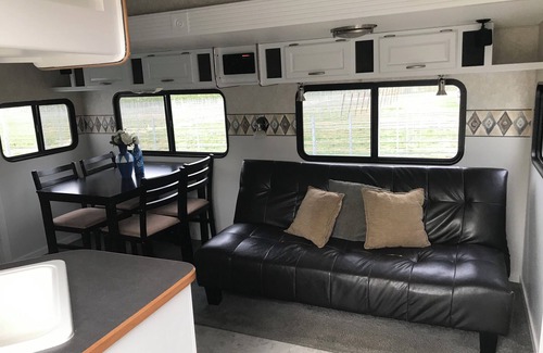 A real home away from home as the trailer is stocked with everything you might need for a weekend including linens, towels, toiletries and cooking supplies. Coffee pot and complimentary coffee provided as well as toaster and pots and pans. Glamping without having to worry about the details. This agrtourism site we rejuvenate your souls and reconnect you with the land.