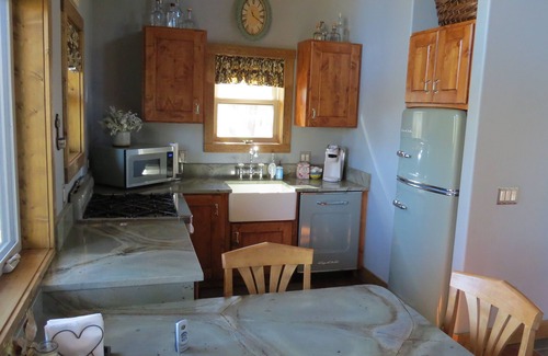 The house is just 3 miles north of historic Pagosa Springs with its hot springs, trails, restaurants and coffee shops — closer to Wolf Creek than if you stay in the Pagosa Lakes area. The Hideaway has two bedrooms, 2 baths, full kitchen, washer/dryer, front deck, back deck with grill, and the spiral staircase is an exquisite touch. Everyone raves about the Big Chill retro kitchen appliances.