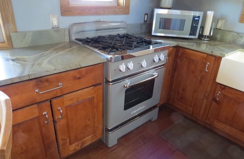 Each of the 2 bedrooms have fluffy queen-sized beds and the cozy living room has an easy-to-use, gas fireplace encased in gorgeous rock. Super tall ceilings with massive wood beams add to its charm. The fine craftsman finish includes solid maple and slate flooring and custom solid-wood cabinets.