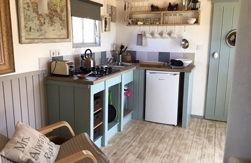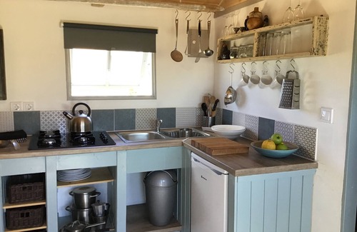 The cabin part of this property houses a functional and well decorated kitchen and lounge area .
