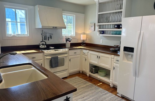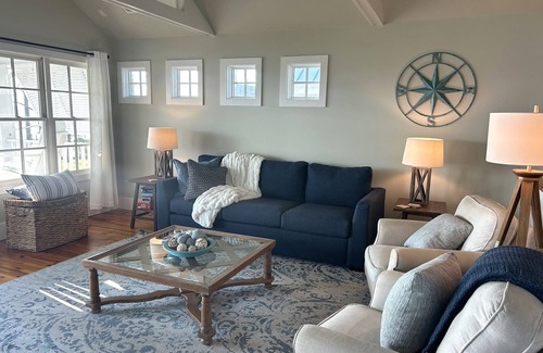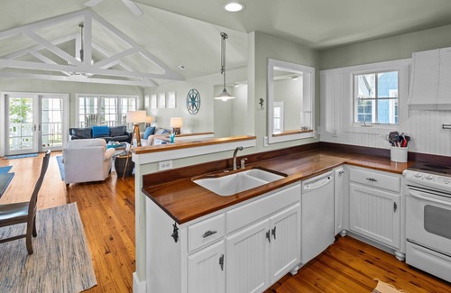 This 2 bedroom, 2.5 bath (there is a 3rd room that has been converted to a guest room) cottage overlooks the Neuse River and houses six guests comfortably. The floor plan is reversed with three bedrooms downstairs including laundry room with full size washer & dryer. The primary bedroom has a king bed, private bath with shower and private porch overlooking the water. The front bedroom has a queen bed and shares a full bath connecting to the guest room with two twin beds.