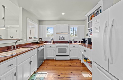 This 2 bedroom, 2.5 bath (there is a 3rd room that has been converted to a guest room) cottage overlooks the Neuse River and houses six guests comfortably. The floor plan is reversed with three bedrooms downstairs including laundry room with full size washer & dryer. The primary bedroom has a king bed, private bath with shower and private porch overlooking the water. The front bedroom has a queen bed and shares a full bath connecting to the guest room with a queen bed.