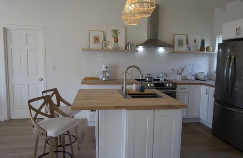 This lovely fully renovated (2024) beach villa offers two bedrooms with ensuite bathrooms surrounding an open concept kitchen, dining and living room area that opens onto a large patio to enjoy the views of a beautiful tropical garden that dives into the turquoise waters of Hoopers Bay (aka Turtles Bay) on Great Exuma in the Out Islands of the Bahamas.