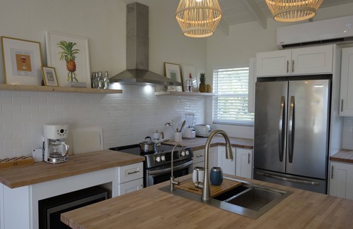 The two cozy AC bedrooms feature a queen bed and two twin beds, with soft linens and fluffy pillows, in which you will enjoy peaceful nights of sleep. If you choose to opt out of AC, you can open the screened windows to enjoy the sea breeze blowing through the palm trees. Each bedroom benefits from an amazing view of the tropical garden and the turquoise waters of Hoopers bay. The master bedroom has a smart TV for you to enjoy your favorite shows or to complete your peaceful ambiance with streaming music.
