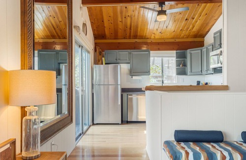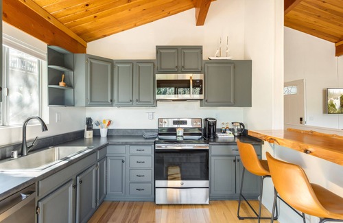 Enjoy the vaulted ceiling in the living room with views of the forest through the sliding glass doors. A fun selection of toys & games available or access all of your own TV content (via Roku smart TV) while curled up on the couch.