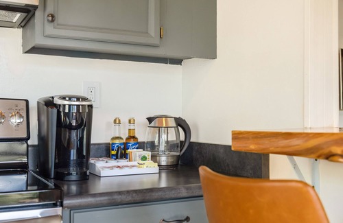 Our kitchen with an electric stove offers complete sets of plates and cups for adults and kiddos, essential cookware, and microwave. We provide a Brita pitcher in the fridge and stocked spice cabinet. We supply coffee, sugar, and creamer. As well as an electric hot water kettle and a assortment of teas.