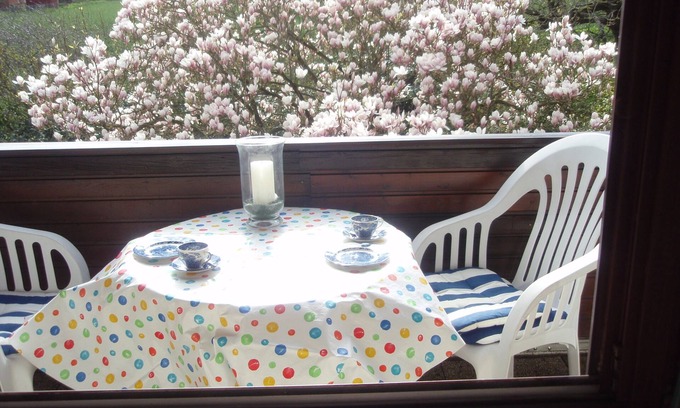In the middle of fishing near the Schlei Fjord our apartment is quiet yet central location in a large park-like garden. Lawn and barbecue invite you to relax. The apartment modern, sunny with plenty of room is bright and friendly. It has two levels. The upper area is a bedroom with two full size beds, before a large bed on Galerie..Das large Wohnstudio has two folding beds. Sofas, 1 reclining chair and table invites to reading and watching TV. SatTV and WlanDie exists. The kitchen is fully equipped. Microwave, oven 4 ring gas cooker, toaster, kettle and coffee machine are available. Large dining table and chairs. Two balconies, one with garden furniture for sunny coffee drinking.