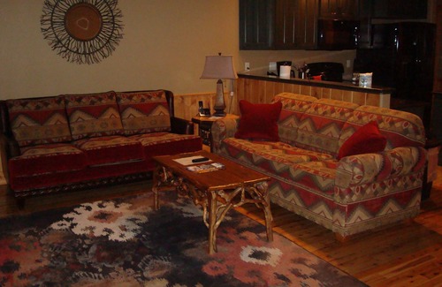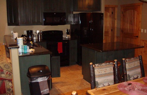 This spacious, 1,400 Square Foot cabin features Two bedrooms, Two baths (walk-in showers) , 2 pillow top kings, plus queen pull out sleeper in living area, privately sleeps a total of 6. The kitchen is fully equipped with all small appliances, in-door ice and water dispenser, stoneware, flatware, crock pot, baking pans, etc. The utility area features a full size washer and dryer.