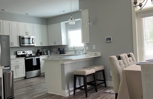 Escape to this delightful new townhome in picturesque Jarvisburg near the outer banks beaches. This charming property features 3 bedrooms - 2 queen beds and 2 sets of bunk beds, perfect for families or friends looking for a peaceful retreat. With 3 bathrooms and a cozy living room with a sofa bed, a well stocked spacious kitchen guests will have plenty of space to unwind. Take time out to relax and enjoy the conveniently located community pool. Whether you're enjoying the outside lounge with a grill, fire pit, outside table with 6 seats and additional seating, WiFi, or AC, this tremendous townhome has everything you need for a comfortable stay. We look forward to hosting you at our place.