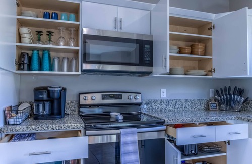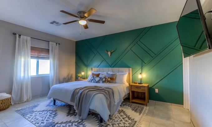 Fun pops of color can be found in the bedrooms with our navy blue and desert green feature walls. Three bedrooms comfortably sleeping 6 are situated in the back (green desert bedroom: 1 King with private full BR, navy bull bedroom: 1 Queen, light and airy bedroom: 1 Queen) . Are you a tummy, back or slide sleeper? Choose your favorite pillow, gusseted or luxury cooling gel pillow, offered for each guest. Enjoy a comfortable nights rest on your green tea infused, pressure relieving memory foam mattress and soft cotton sheets. Mirrors, spacious closets, lamps with USB ports, bamboo cordless shades, linen curtains, throws and bath towels can be found in each bedroom.
