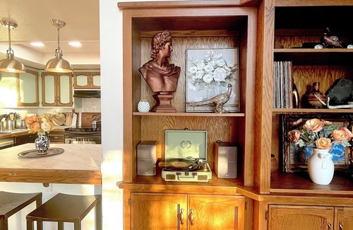 In the adjoined dining areas, you'll find a fully stocked coffee station and 3 separate dining tables, (with 14 seats total, including the kitchen island stools.) You'll also find a large comfy window bench from which to admire the giant oak just outside and the gorgeous mountain range in the distance.