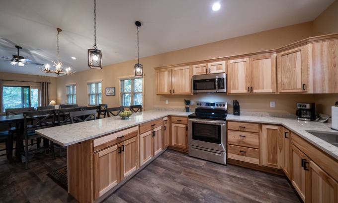 Escape to this beautifully built, brand-new 4-bedroom, 2-bath cabin (duplex) on the scenic shores of Lake Namakagon (Garden Lake), located in the heart of Cable, Wisconsin. Designed for large families, multi-family trips, or group getaways. This spacious retreat comfortably sleeps up to 16 guests and delivers stunning lake views and modern comforts of home.