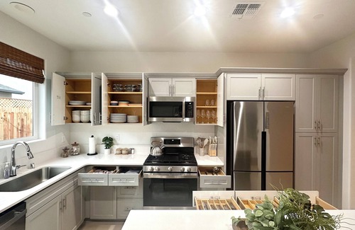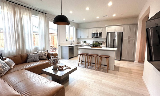Experience comfort and relaxation in our 4-bedroom, 3-bathroom, 2-story home. Featuring a 2-car garage with an EV charger, a beautiful outdoor space with a hot tub, BBQ grill, and cozy seating area, this retreat is nestled in a safe and new-build neighborhood in Visalia, CA.