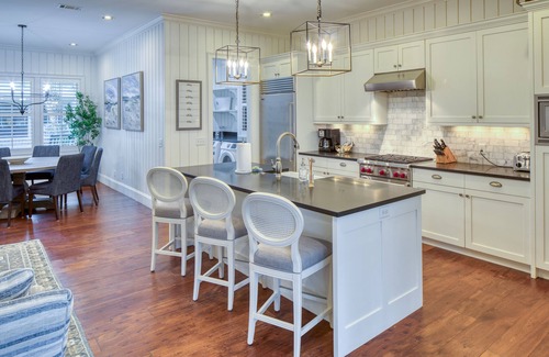 • Gourmet chef's kitchen with high-end appliances, island seating, and stocked for cooking or private chef service
