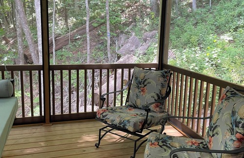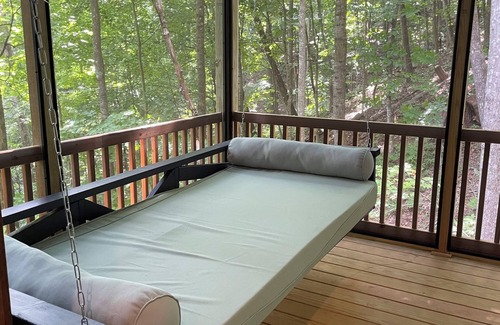 Your Montreat adventure begins at this delightful 6-bedroom house. With 1 king bed, 3 queen beds, 2 twin beds, 2 bunk beds, 1 full bed, and 1 sofa bed, there's plenty of space for all your guests. Immerse yourself in the charming atmosphere of this quaint property, complete with a fitness area , 2 washing machines, iron, heating, hair dryer, WiFi, and AC. The 4 bathrooms offer a soaking bathtub with a woods view and hair dryer for your convenience . Enjoy your time in Black Mountain at our gorgeous house. This house is nestled in the woods creating a treehouse feel. Twin water heaters for long showers double ovens for big family meals and three parking spots. Remote feel but an 1/8 of a mile to Lake Susan. The home has large decks to relax on and a screened porch with a day bed for napping or spending the night! Driveway goes directly to house for easy entry.