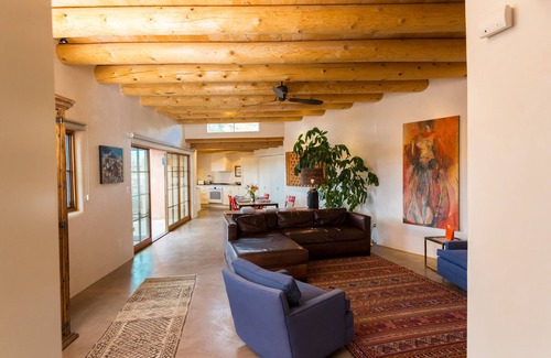 Casa Miguel is a modern custom built home located in the desirable Historic Eastside of Santa Fe. The house sits on a hill providing some of the very best views that Santa Fe has to offer of the Sangre de Cristo Mountains, Sun and Moon Mountains and off to the west for ultimate sunsets. It is less than a 10-minute walk to the Plaza and a ¼ mile to the famed Arts & Crafts of Canyon Road. The house has AC if it's hot and plenty of fresh air with large opening doors, and overhead ceiling fans in the living room and bedroom.