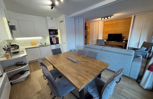 At the top of the resort (j6) ideally located in a recent chalet and renovated in October 2024, very nice apartment of 60 m2 with beautiful living room, new kitchen super equipped. 2 bedrooms and in total 8 beds but rented for 6 people maximum.