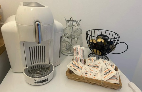 The kitchenette is equipped with a stovetop and a refrigerator, as well as a coffee maker, an electric kettle, and a microwave. Bathroom amenities include a hair dryer, towels, and toilet paper. Other amenities at this 1-bedroom, 2-bathroom rental include bed sheets, a desk, housekeeping, and heating.