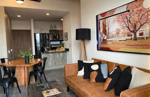 Hermoso departamento completamente nuevo y amueblado con un increíble diseño único. Con alberca y sala de usos múltiples. Espacio suficiente de hasta 5 personas, 2 recamaras, 2 baños, sala-comedor.