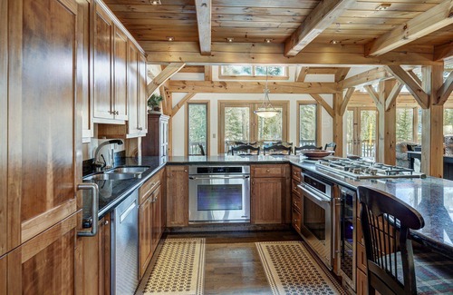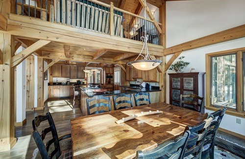 Dining Room: The dining room is nestled next to glass French doors allowing for large family dinners and beautiful mountain views! The rustic wood table has seating for eight people, plus five bar seats at the kitchen island.