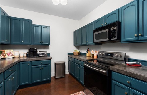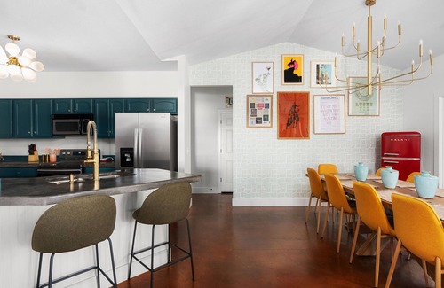 Our luxurious 5-bedroom+game+theatre room home is for 16+ guests designed to celebrate your getaways & milestones. Indulge in the private pool, rejuvenate in the hot tub, enjoy endless fun in a game room, or cozy up in the theatre room. The backyard with bowling & a fire pit offers magical spaces for connection. Relax on comfy beds, trendy indoor spaces & explore nearby activities.